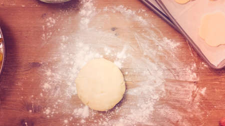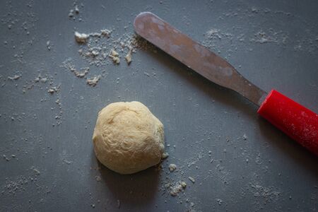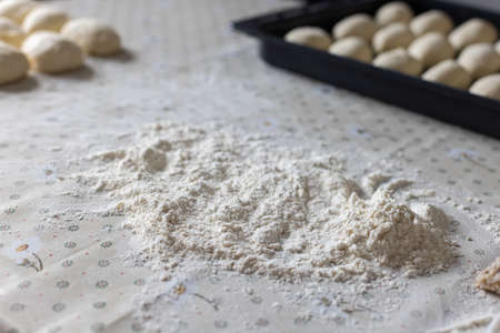 Flour and dough for pies on the kitchen table. Baking at home. Selective focus.