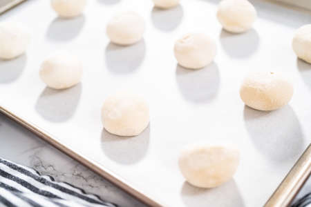 Lined baking sheet with dough shaped into balls. Generative AI