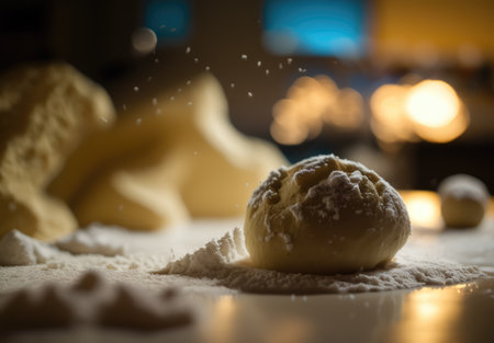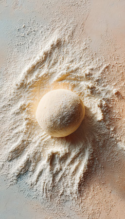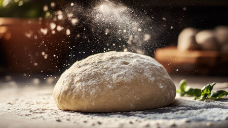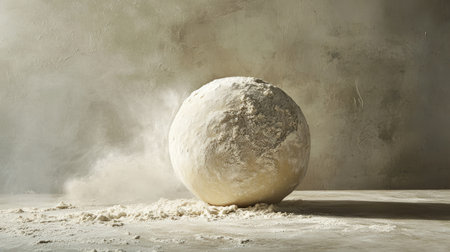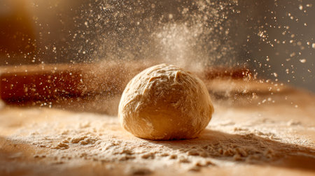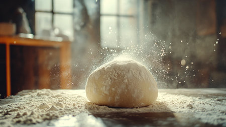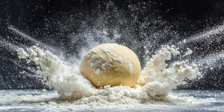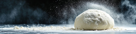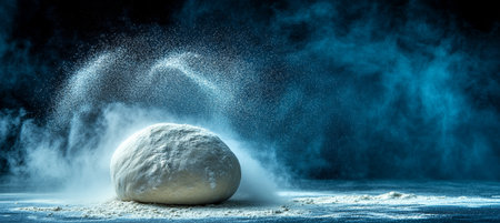 Freshly Kneaded Dough Covered in Flour With a Dramatic Flour Explosion on a Dark Background