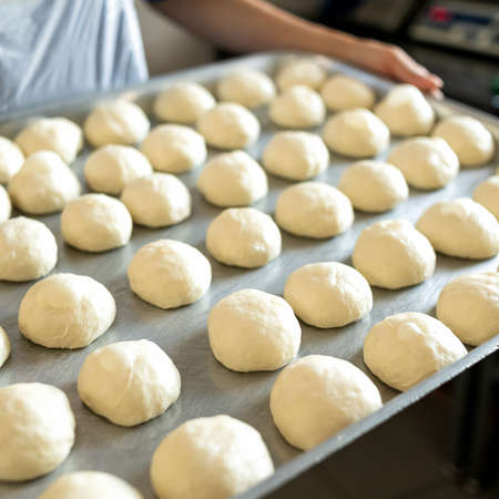 Pieces of raw dough on baking sheet. Round buns, cooking process. Baker holding a tray of rising yeast dough. Soft focus. Close up shot.