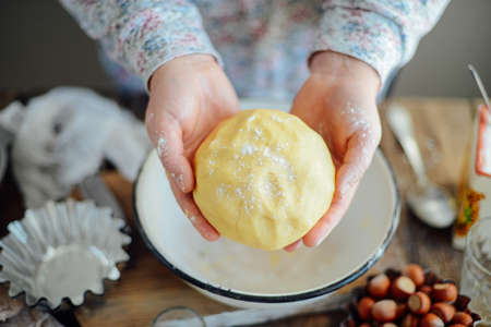 Woman hands kneading dough prepare for baking cookies in the kitchen