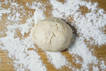 Yeast dough on a wooden table sprinkled . Top view, wooden background, space for text