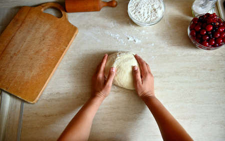 High angle view of female hands kneading dough on the kitchen countertop, preparing delicious traditional Ukrainian dumplings. Process of cooking dumplings step by step