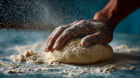 A close-up image of a hand kneading fresh dough with flour dusting on a wooden surface, capturing the artistry and warmth of homemade baking.