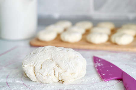 Bread dough on floured board ,making bread rolls at home.,homemade.