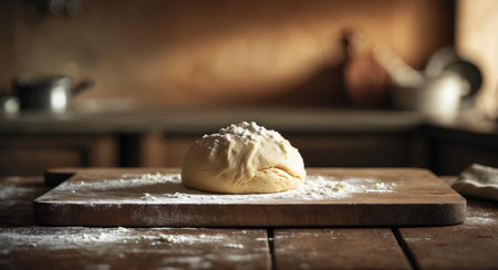 AI Generated. Wooden cutting board with pastry dough ready for baking and preparation in a kitchen setting
