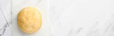 Ball of dough for baking on white marble background with dusting of flour. Recipe step by step. Selective focus. Banner.