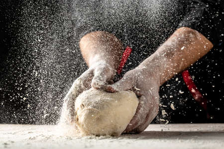 Beautiful and strong men's hands knead the dough from which they will then make bread, pasta or pizza. A cloud of flour flies around like dust. food concept