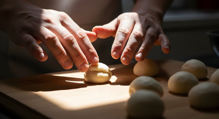 Close-up of hands shaping smooth dough balls on a wooden surface, illuminated by natural sunlight. The image captures the art of baking, homemade food preparation, and the culinary process in a kitchen.