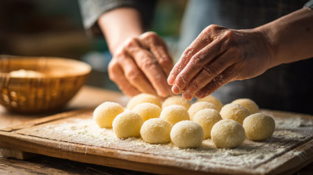 A close-up of skilled hands expertly shaping traditional dough balls on a wooden surface, surrounded by flour, showcasing the artistry of culinary preparation.