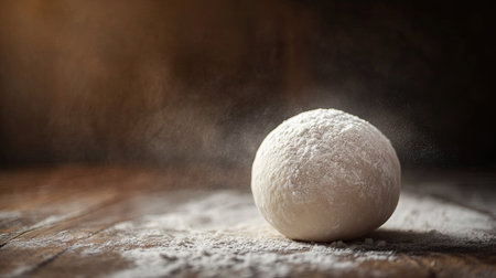 Round ball of wheat dough on a wooden table covered with flour, natural lighting highlighting the texture.