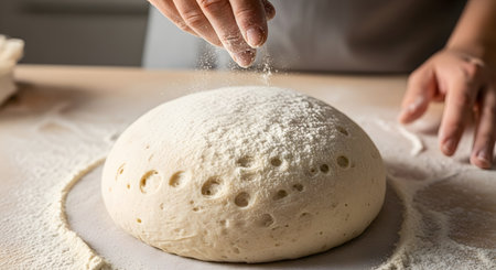 A close-up view of a bakers hands gently sprinkling white flour onto a large, round, proofed loaf of bread dough on a floured countertop, preparing it for baking.