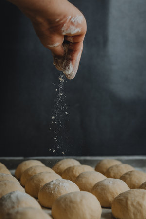 A person adding flour to homemade pastry dough balls
