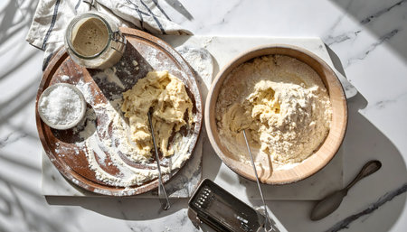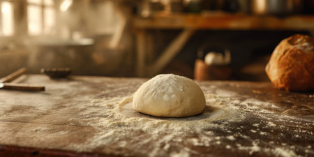 Round dough ball on a table, flour and baking tools scattered, light creating gentle shadows.