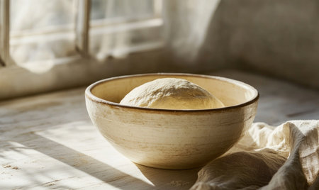 Dough proofing in a ceramic bowl under linen cloth, captured with harsh cinematic sunlight.