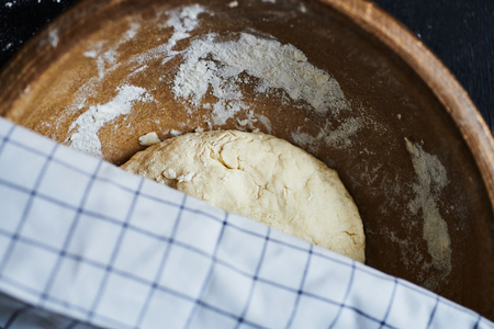 Bowl with dough and towel on a wooden table in the kitchen