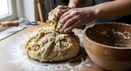 A baker's hands firmly knead a ball of dough on a flour-dusted wooden table. A wooden bowl sits nearby, capturing the rustic and authentic process of making homemade bread or pastry.