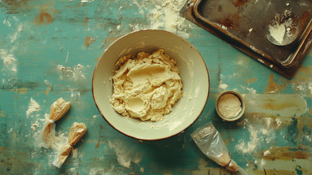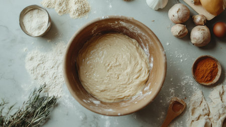 A beautifully captured overhead view of a rustic kitchen scene featuring a mixing bowl of dough, flour, and baking tools on a textured wooden table.
