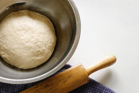 Dough Making Process. Dough ball in the bowl. White background. Top view. Copy space.