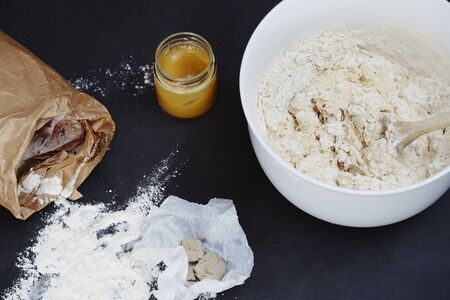 Dough preparation on a dark background. Food concept. Cooking process