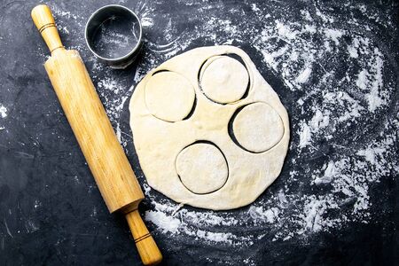 The process of cutting circle from the dough on a dark background. Top views, close-up.