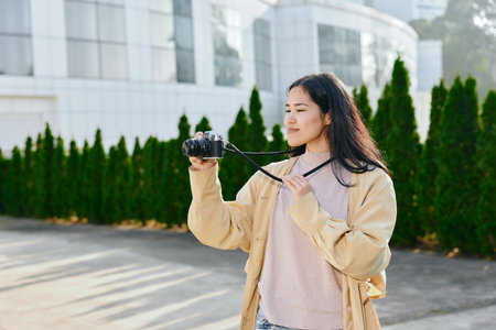 Candid photography scene of a young woman holding a camera, outdoors near modern buildings, casual attire, focused on framing a shot, daylight and calm urban atmosphere