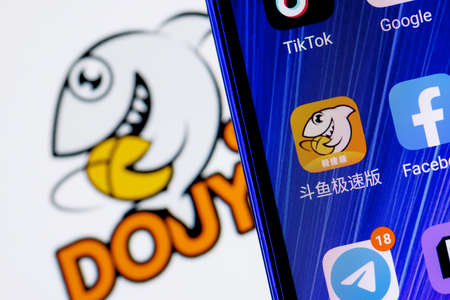 Kazan, Russia - Nov 21, 2021: The icon of the DoyUy live streaming service application among other applications on the smartphone screen. On the background is the DoyUy logo.