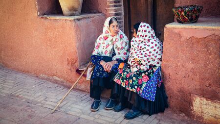 Abyaneh, Iran - May 2019: Elder women with traditional Persian clothes is sitting in an old street