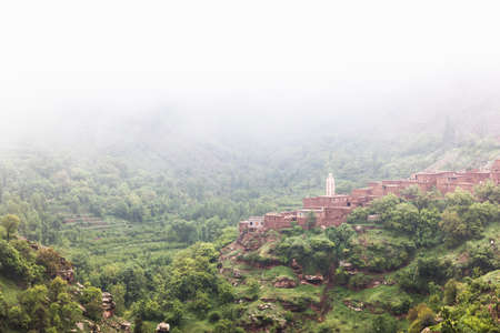 Misty landscape view of hillside village, Ourika Valley, Marrakech, Morocco