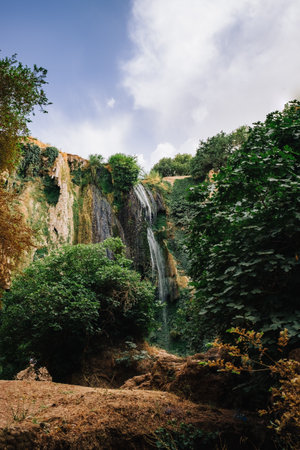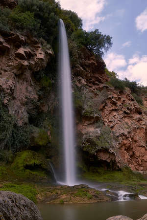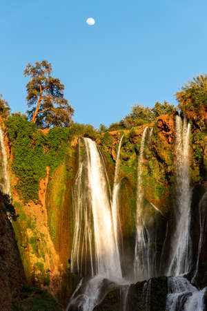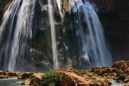 Beautiful photo of Ouzoud waterfall in Morocco with soft flowing water and large colored rocks. Green wild jungles on background