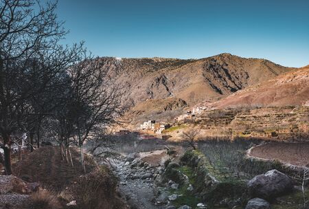 Toubkal National Park very close to the small village of Imlil in the Atlas Mountains, Morocco. Hiking trip with blue sky and houses. Mountains in background. Sunny day.