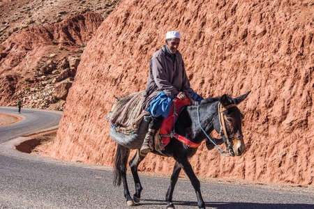 Ouarzazate, Morocco - Oct 21, 2019: People on the roads through the High Atlas Mountain range between Marrakesh, Ait Ben Haddou and Ouarzazate