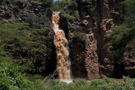 View of Waterfall, River draining into lake, Makalia Waterfall, Lake Nakuru N.P., Great Rift Valley, Kenya