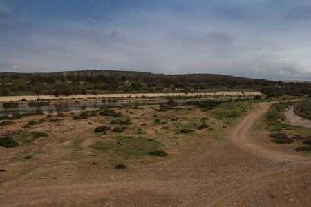 Country with grass and bushes. River Oued el Kassab in the middle. Small hill covered with trees in the background. Cloudy early evening sky. Essaouira, Morocco.