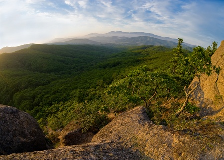 Fish-eye view of majestic sunset of the Russian Primorye mountains landscape
