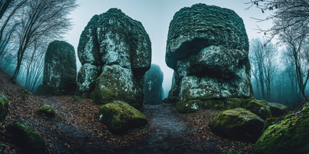 Mysterious Mossy Rocks Enigmatic Forest Path Nature Scene fog old mist dark view wild calm dark deep