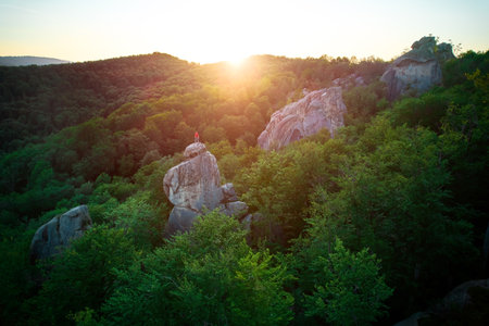 Aerial view of climber standing atop rock formation at Dovbush Rocks in Carpathian mountains, Ukraine. Sun sets, casting warm glow over lush, green forest, distant hills, creating breathtaking view.