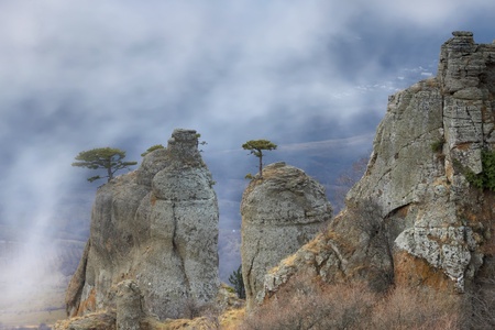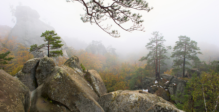 cedars grow on rocks yellow autumn forest, mist.panorama