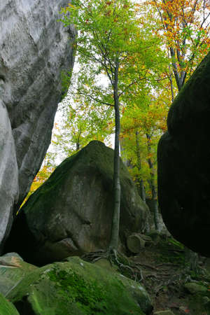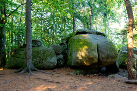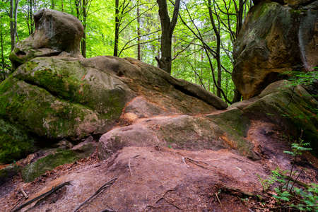 Beech forest with sandstone rock outcrops and big boulders in springtime. Landscape park Dovbush rocks, Carpathian mountains, Ukraine