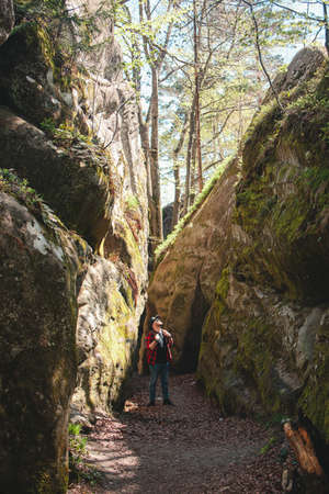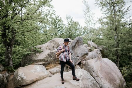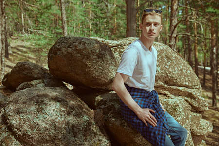 Tourism, nature exploring. Portrait of a handsome guy hiker resting by the rocks in a pine forest during the hike. Active rest, hiking, adventure.