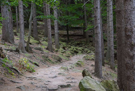 Stone stairs in footpath in Lower Silesia, Poland. Autumn time