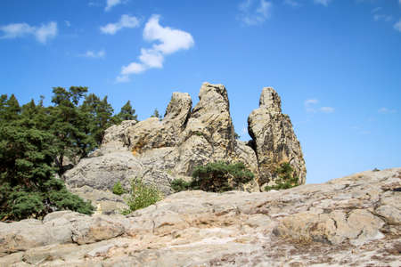 Grand stone pillars on the slopes of Mount Demerdzhi. Valley of ghosts, Crimean Mountains.