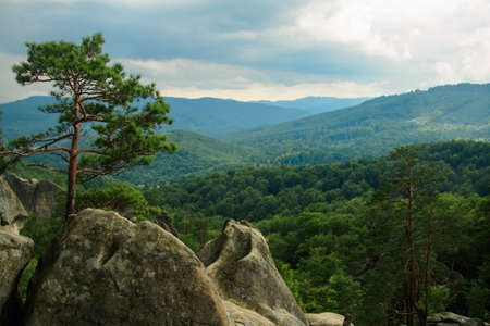 Landscape with high stone rock in a green forest under a blue sky on a background of mountains. Copy, empty space for text.