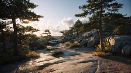 Scenic Mountain Vista with Pine Trees and Rocky Terrain at Sunrise
