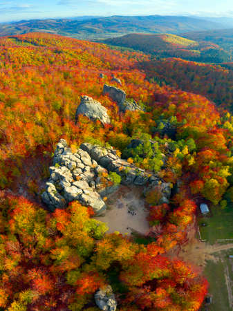 Aerial photo drone copter beautiful autumn beech forest and ancient rocks of Dovbush in Bubnishche Carpathians Ukraine, pagan temple and caves of a Christian monastery, tourist famous place