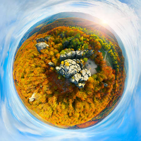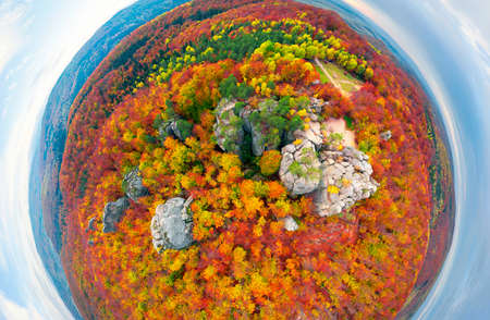Aerial photo drone copter beautiful autumn beech forest and ancient rocks of Dovbush in Bubnishche Carpathians Ukraine, pagan temple and caves of a Christian monastery, tourist famous place. 360 ° panorama