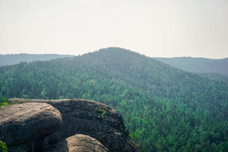 Landscape of Siberia mountains Stolbi, rock peak range in haze in summer
