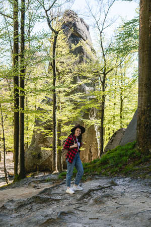 young girl tourist in the forest, Fortress, Tustan, Carpathians, Western Ukraine