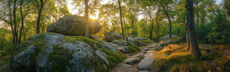 A peaceful moment unfolds in Fontainebleau as golden sunlight streams through towering oak trees, illuminating mossy boulders and inviting hiking trails.