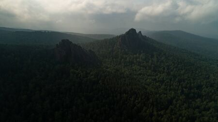 Giant stone pillars from the mountain. Orange morning sun. Cinematic aerial drone flight drift. Beautiful best Russian nature